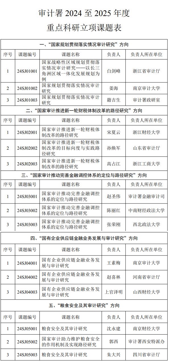 2024年2月,审计署发布了2024至2025年度公开招标重点科研课题的通知。截至3月31日,共收到课题立项申请113份。经专家评审并报审计署批准,“国家战略性区域规划贯彻落实情况审计研究——以长三角洲区域一体化发展规划为例”等15项课题被确定为立项课题。